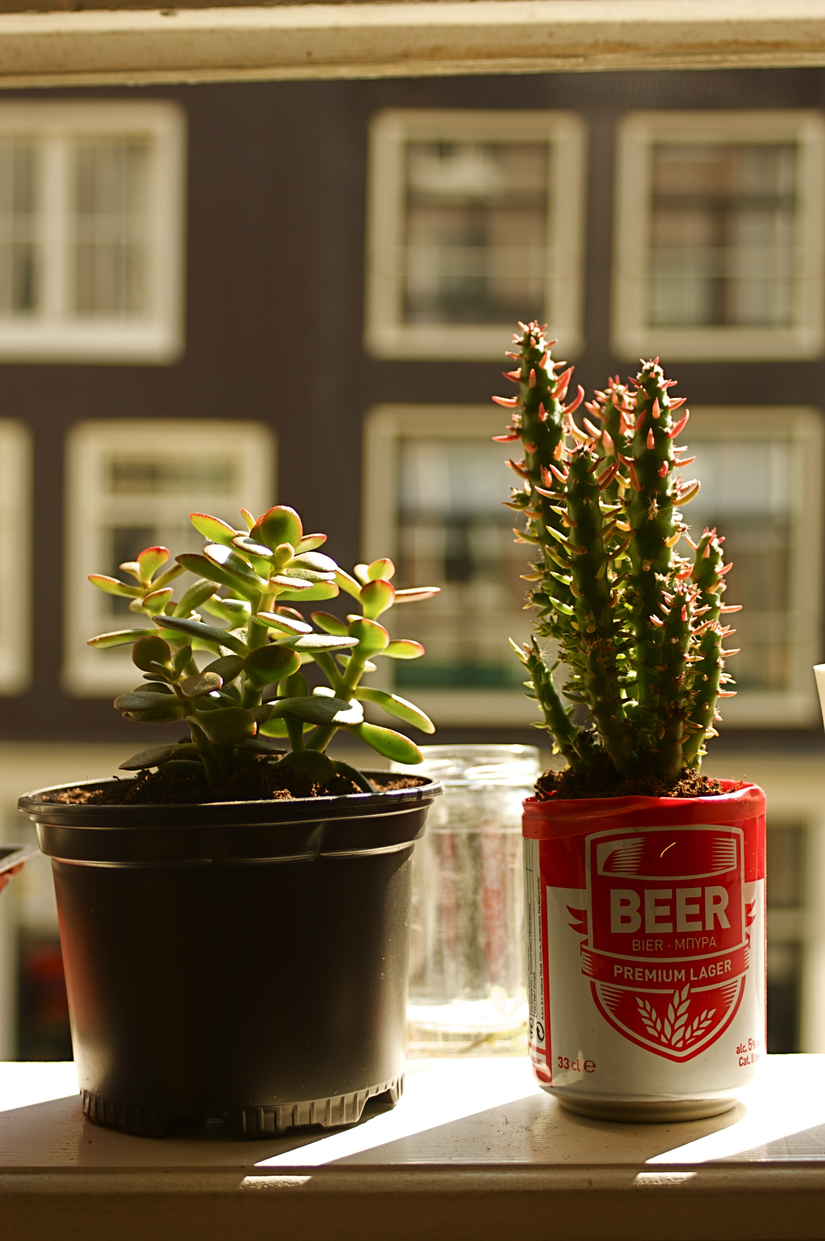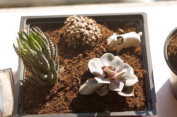 and i replanted my succulent babies. note the re-purposed generic beer can. stay classy.