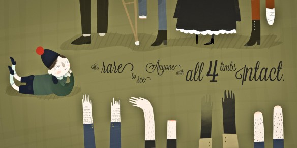 Posted in illustration | Tagged arms, boy, feet, hands, illustrations, it's rare to see anyone with all 4 limbs intact, legs, war fields | Leave a reply